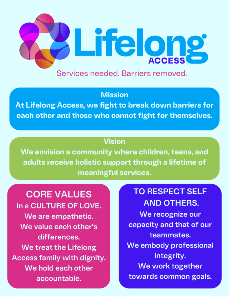 At Lifelong Access, we fight to break down barriers for each other and those who cannot fight for themselves. We envision a community where children, teens, and adults receive holistic support through a lifetime of meaningful services.