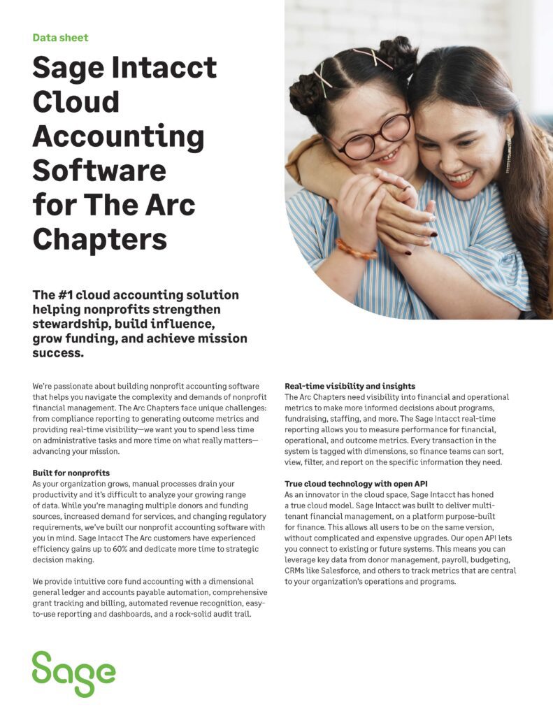 Sage Intacct is the AICPA’s preferred provider of cloud financial applications. At Sage Intacct, we help nonprofits strengthen stewardship, build influence, grow funding and achieve mission success. We’re proud to partner with Chapters of The Arc to help streamline grant accounting, automate manual processes and deliver real-time visibility into the financials and metrics to help further your mission.