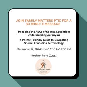 Navigating the world of special education can feel overwhelming, especially with all the acronyms used in meetings, documents, and conversations. This parent-friendly webinar is designed to decode the most common acronyms in special education, such as IEP, FAPE, LRE, and more. Participants will gain a deeper understanding of these terms, learn how to use them effectively when advocating for their child, and access valuable resources for ongoing support. Whether you’re new to special education or looking to enhance your advocacy skills, this session will empower you with the knowledge and confidence to navigate the special education system successfully. Join us and take the first step toward becoming a more informed and effective advocate for your child’s education!
