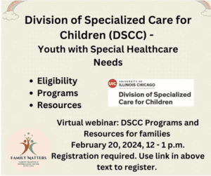 The University of Chicago, Division of Specialized Care for Children will be presenting the webinar DSCC Programs and Resources for Families on February 20th. Register by clicking the link below! https://us06web.zoom.us/webinar/register/WN_K28JFkOVR1STXDGldO0jZ |